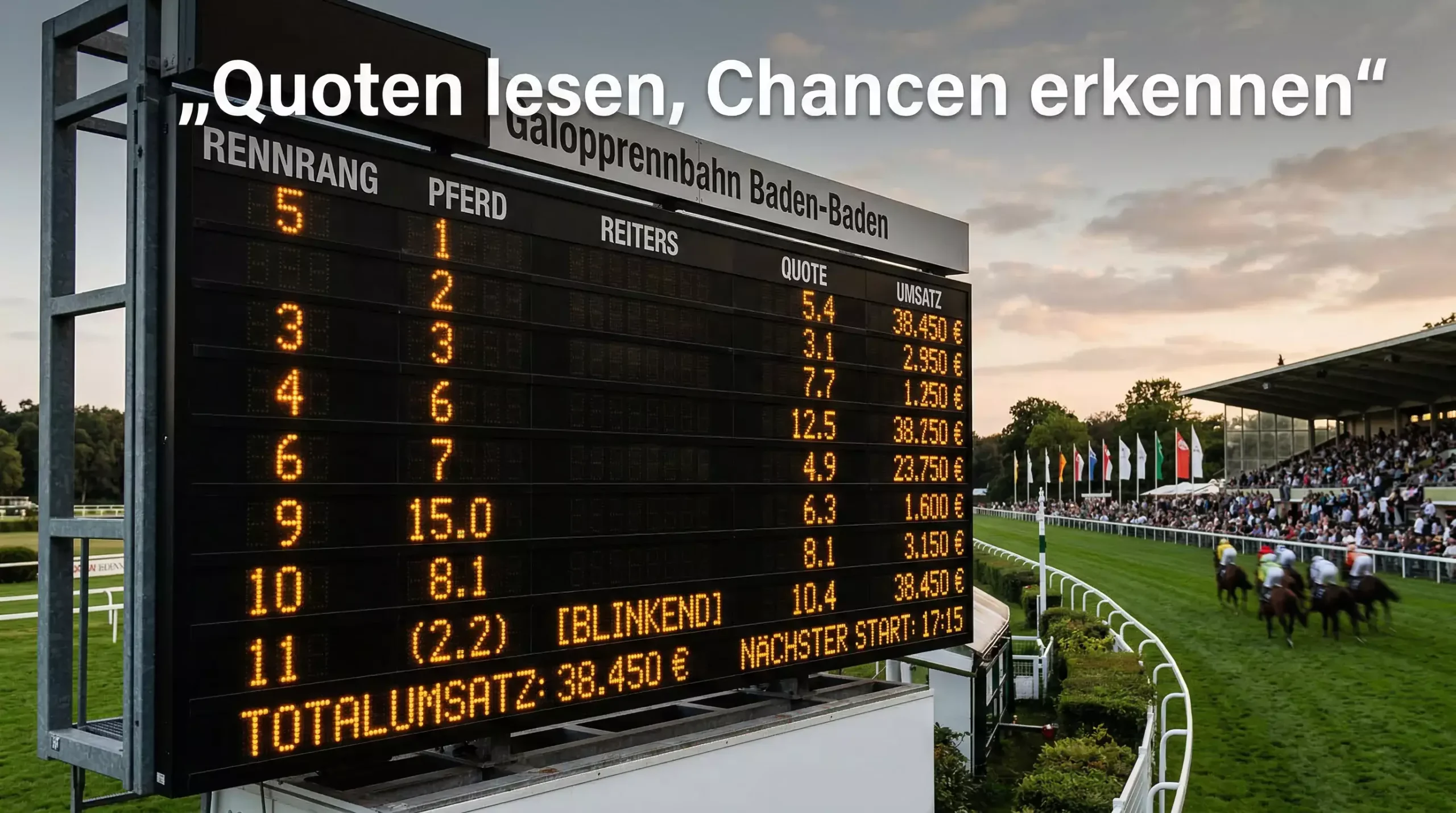 Die Faustregel für Einsteiger: Vergleichen Sie immer die Quote mit Ihrer eigenen Einschätzung. Wenn Sie das Rennen nicht analysiert haben, können Sie den Wert einer Quote nicht beurteilen — und wetten dann auf gut Glück. Das funktioniert manchmal, aber nicht systematisch.
